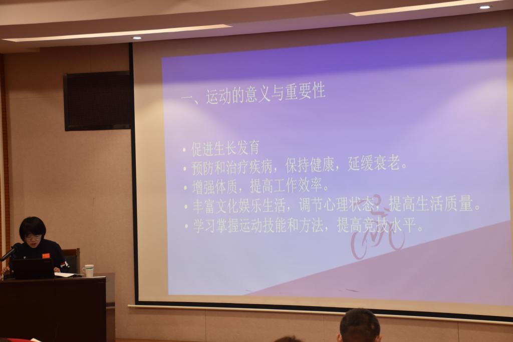 讲座最后,孟妍副研究员从运动的目的、类型、强度、时间、注意事项及应急事项处理方法六个方面介绍了如何进行科学运动。她指出,自愿运动、主动运动、尽全力运动会使运动达到更好的效果,并希望老师们可以重视体育锻炼,掌握适合自己的运动方法。