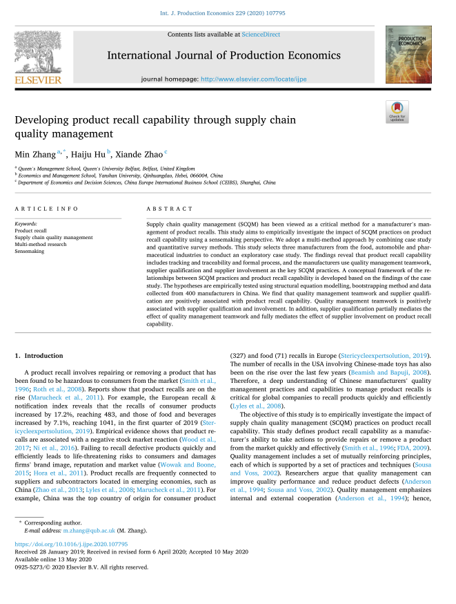 赵先德教授合作的题为《Developing product recall capability through supply chain quality management》的研究成果发表在运营管理领域国际顶级期刊《International Journal of Production Economics》。这篇论文是在胡海菊老师的国家自然基金项目《组织合法性视角下产品伤害危机应对策略的选择及影响机理研究》的资助下完成,论文以采用案例研究和问卷调查两种方法研究了供应链质量管理实践队企业产品召回能力的影响。