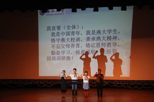 的发展历程和近年来的主要成绩,勉励他们在燕大的新征程中要学会学习、学会生活、快乐成长。随后老生代表、学生会秘书长李泽宝同学和新生代表李晓洁同学分别发言。典礼最后,新生辅导员带领全体2017级新生进行了入学宣誓,誓言鼓舞斗志,振奋人心。