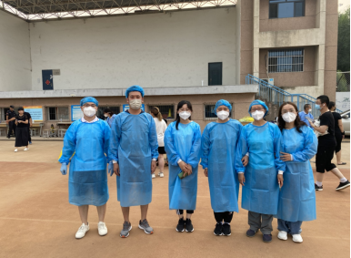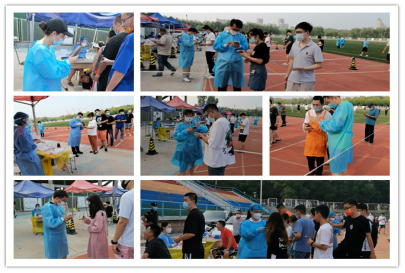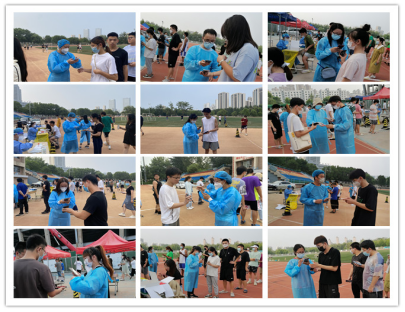 本次志愿服务分别在东西两个校区进行,其中东校区6名教职工志愿者,西校区13名教职工志愿者。19名志愿者早早来到检测现场,进行场地布置和更换防护服后,与医护人员并肩作战,扫码录入信息、发放检测试剂管、疏导密集人群、维护现场秩序,密切有序的配合确保了此次核酸检测工作安全顺利进行。