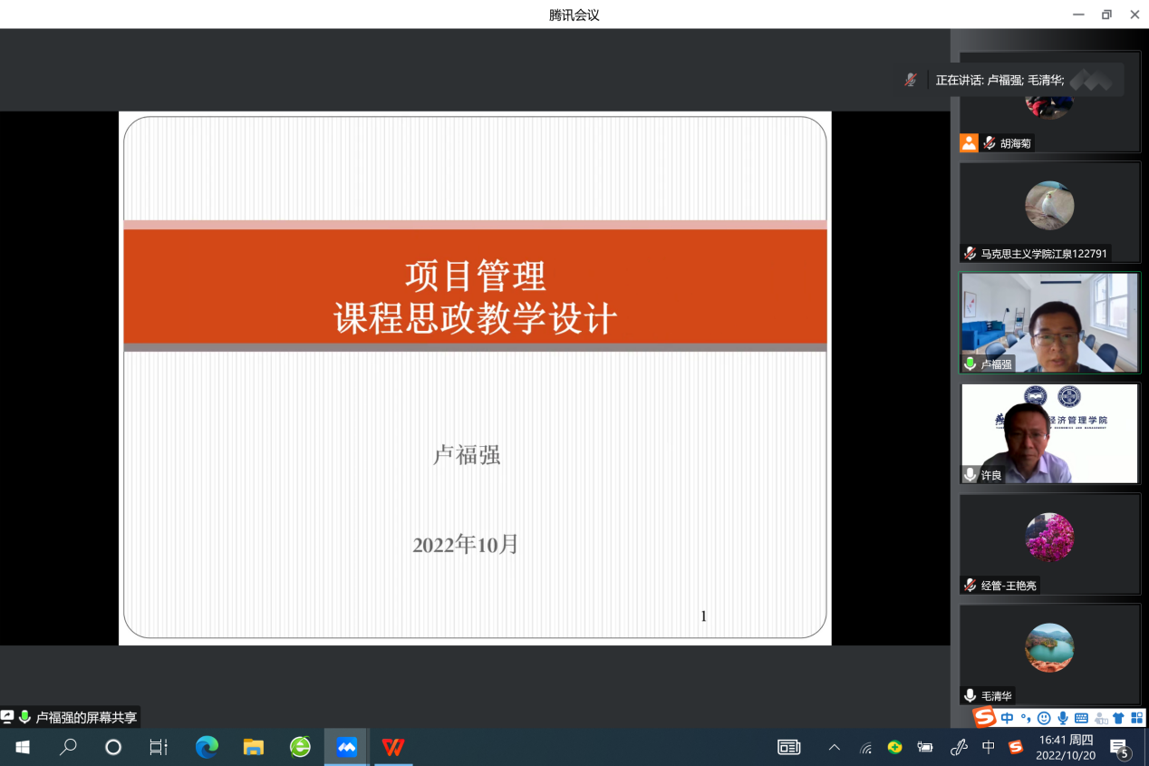 卢福强副教授介绍《项目管理》课程思政相关内容,包括课程思政目标、大四学生学情分析、课程思政设计总体思路,将爱国情怀、奉献精神、实事求是等思政元素融入到项目沟通、项目成本管理、项目质量管理的知识点中。