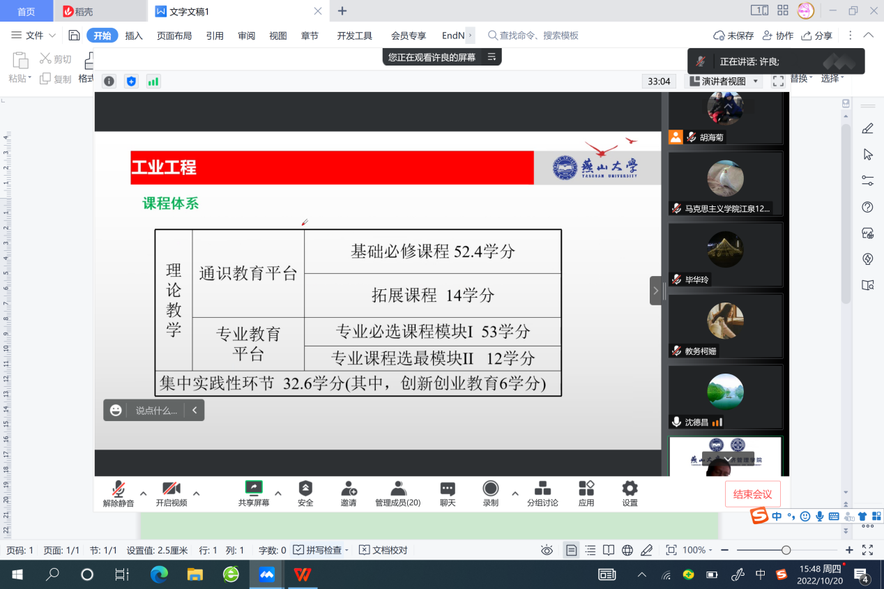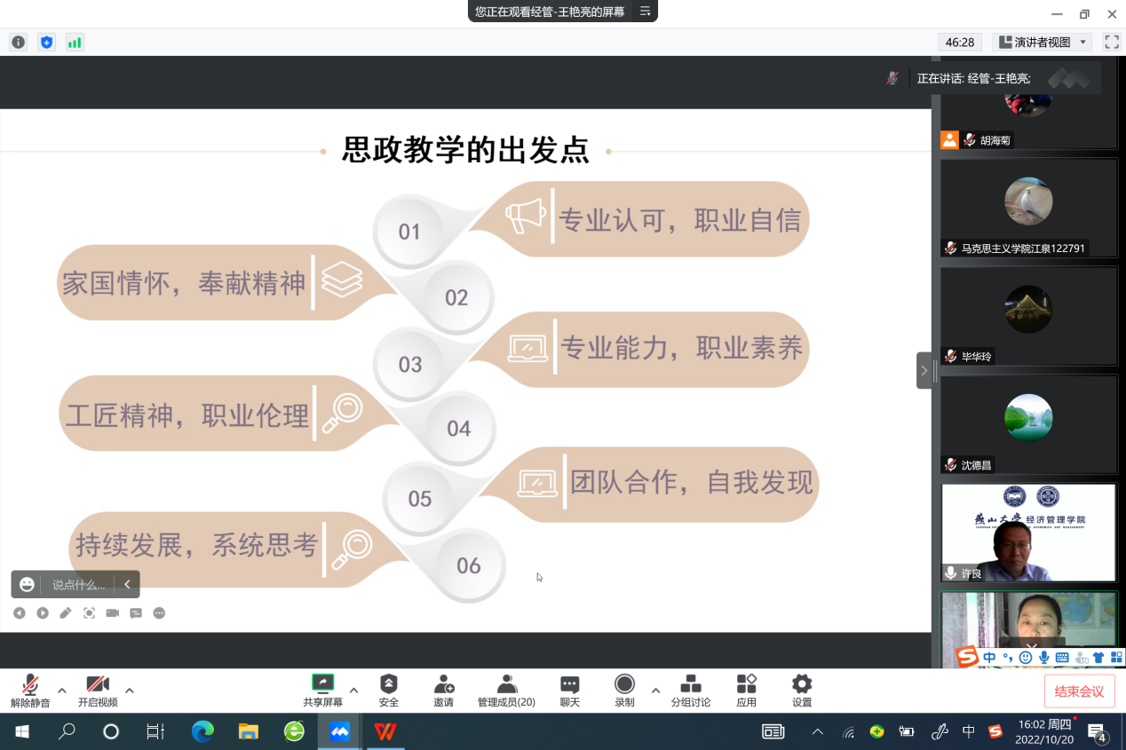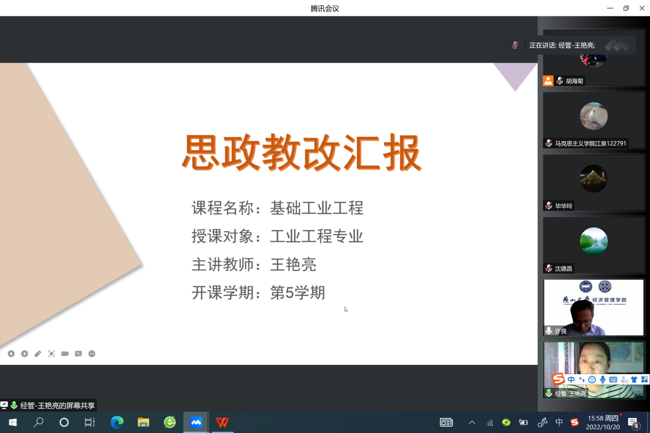 课程思政示范课程、教学名师及教学团队建设方案》(燕大校字〔2021〕233号)和《课程思政与思政课程“双向融合”联合备课教研活动方案》的指导下,10月20日下午工业工程系与中国近现代史纲要教研部开展课程思政与思政课程“双向融合”联合备课教研活动,由于疫情影响,本次联合备课线上进行。参加本次活动的为工业工程系全体教师和中国近现代史纲要教研部6位教师。