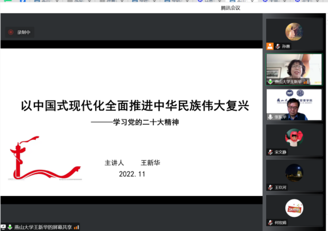 王新华教授从党代会为何如此重要、大历史观视野下的党的二十大、党的二十大的新理论新观点新战略、中国式现代化的历史与理论逻辑和以党的自我革命引领伟大社会革命等五个方面,深入解读了党的二十大精神,阐述了党的二十大召开的历史地位,以及学习宣传贯彻党的二十大精神的重要意义。