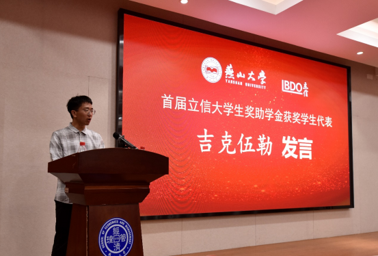 2019级会计专业吉克伍勒作为获奖学生代表发言。吉克伍勒表达了对郭健师兄关心关爱,立信会计师事务所急公好义,亚博体育