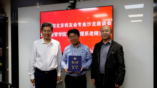 党委书记张振华、副院长靖鲲鹏、王玖河教授一起为工商管理专业建设做出诸多贡献的校友张继超、孙锴颁发职业成长导师聘任证书。