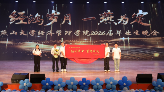 各系教师代表为毕业生们赠送一个富有寓意的“字”,连贯起来组成“经管博学广誉”,这些字不仅是各专业特色的浓缩,更是对经管学子全面发展的殷切期望。同时,毕业生们也将一份特别的礼物敬献给亚博体育