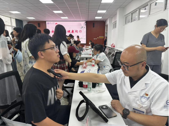义诊活动现场气氛十分活跃,前来咨询、问诊的师生络绎不绝。医护人员充分运用专业所学,耐心的与每一位前来诊治和咨询的师生交流,细致解答大家提出的各种疑问,还为检查中发现问题的师生给予用药指导和健康建议。