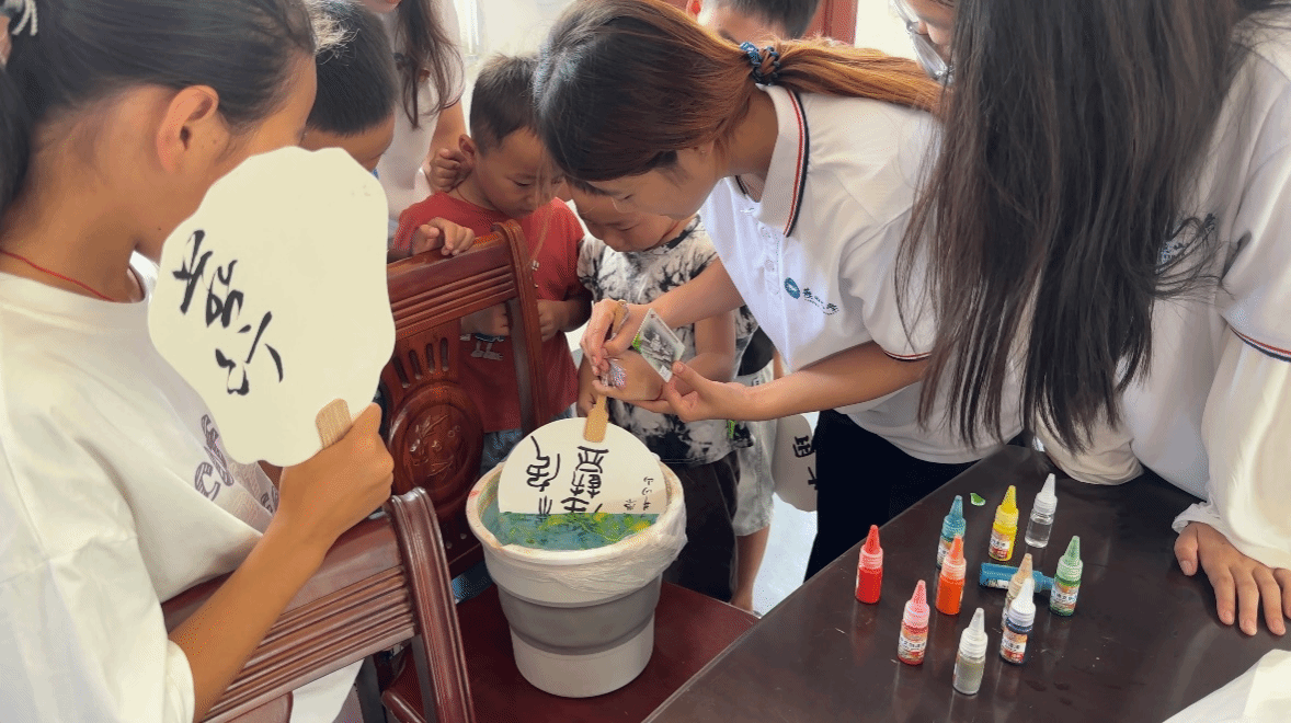 团队成员与调研村孩子制作非遗手工漆扇现场