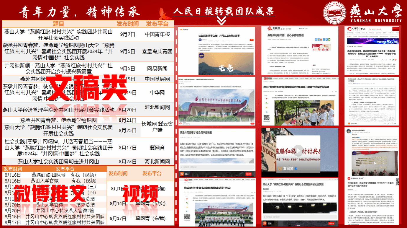 团队实践期间共撰写新闻稿20余篇,制作大型视频近10个。团队事迹先后被《人民日报》、《中国基层网》、《中华网》、《中国青年报》等国家级媒体平台宣传报道;《河北新闻网》、《秦皇岛共青团》、《冀网育》、《长城网·冀云》、《燕大官微》等省级、市级媒体平台广泛宣传,获得多方赞誉和一致好评。