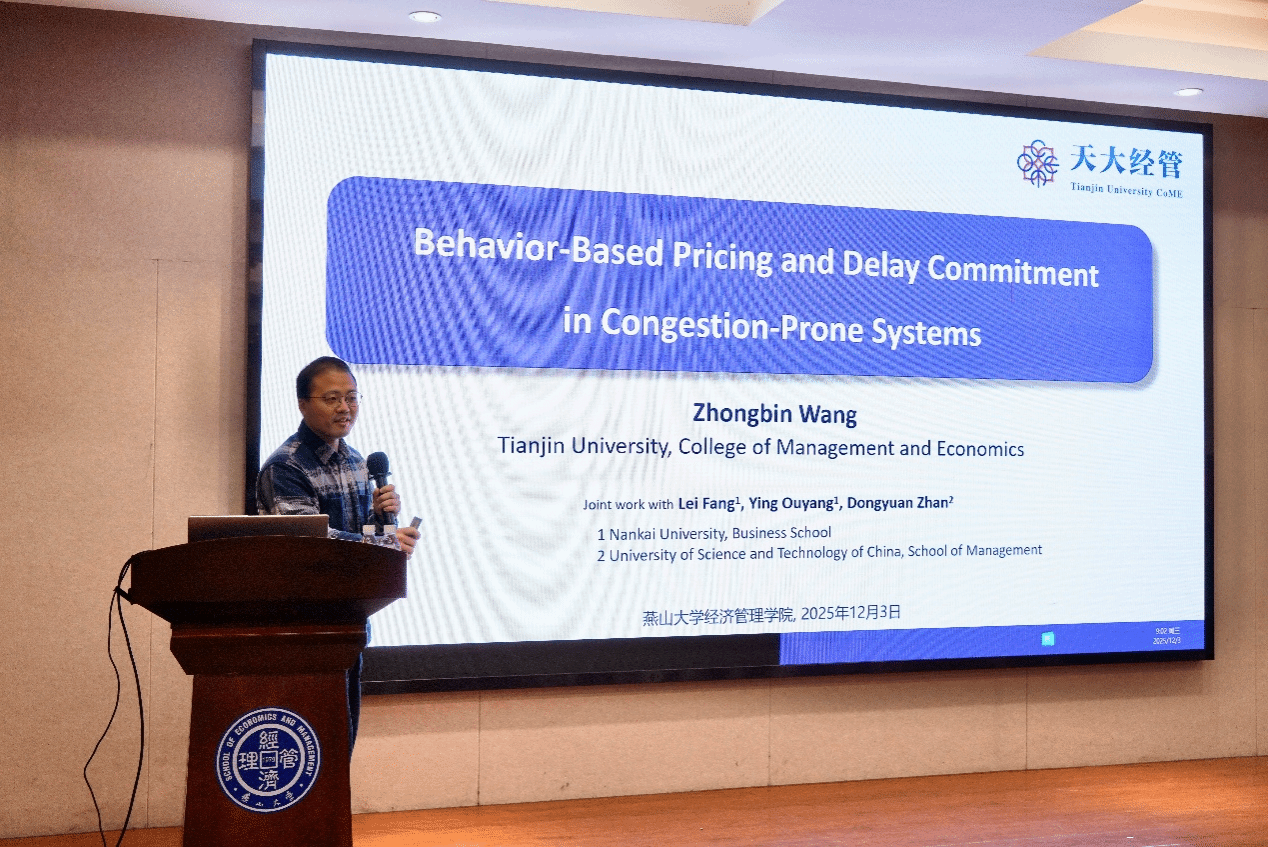 在经管楼A218举办“燕山大讲堂”系列学术报告。天津大学管理与经济学部英才教授、博士生导师王钟彬应邀作题为“外卖服务系统中的杀熟定价与服务承诺”的学术报告。亚博体育