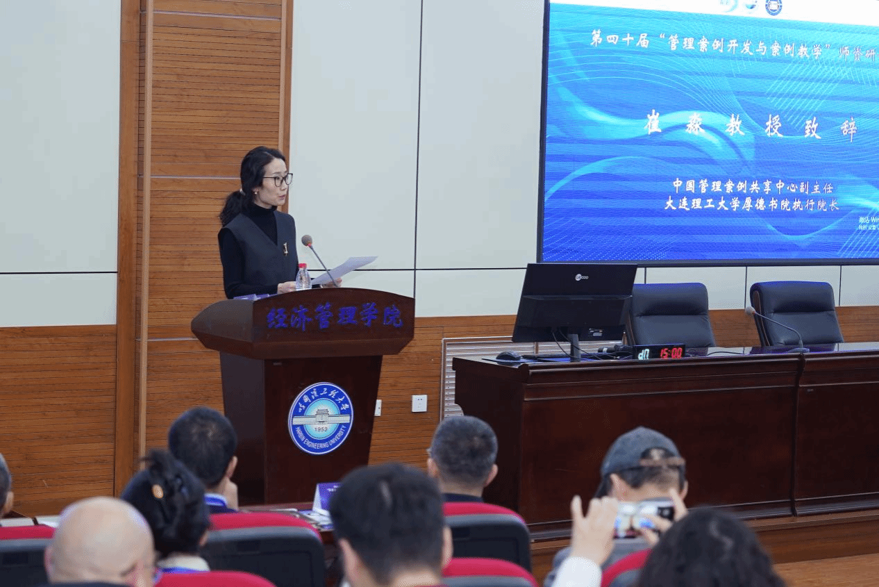 专业学位中心韩国元主任主持。中国学位与研究生教育学会工商管理专业学位工作委员会秘书长、全国MBA教育指导委员会秘书处办公室主任王萍代表全国工商管理专业学位研究生教育指导委员会致辞。她在致辞中表示,本次案例师资研讨会的召开恰逢十四五收官、十五五开局之年。管理案例教学与开发历来被我国高校教育所重视,在工商管理等专业的教学中得到了广泛而充分的应用。感谢哈尔滨工程大学对于本次会议的支持,并充分肯定了中国管理案例共享中心在本土管理案例开发与教学中所做出的贡献。期待未来与各位案例同仁一道,为中国管理案例事业注入新活力。
