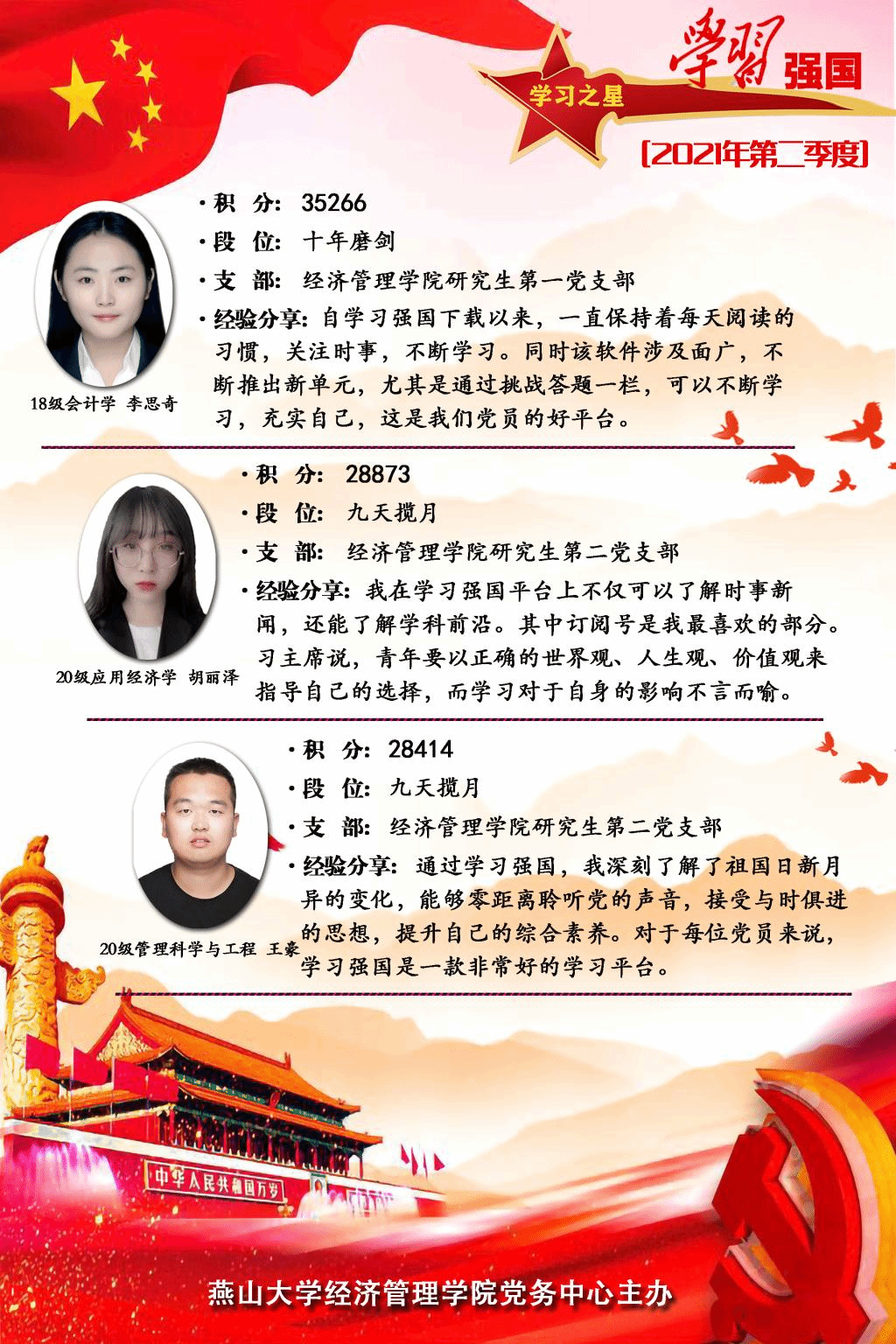 党委以”学习强国“为载体,每个季度开展积分大比拼并评选学习达人活动,覆盖15个学生党支部,参与1000余人次,学习达人学习50000余分。