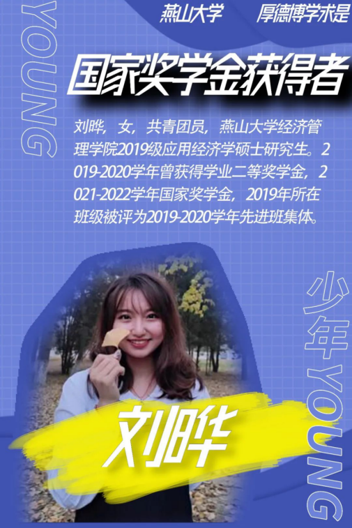 2019级应用经济学硕士研究生。2019-2020学年曾获得学业二等奖学金,2021-2022学年国家奖学金,2019年所在班级被评为2019-2020学年先进班集体。