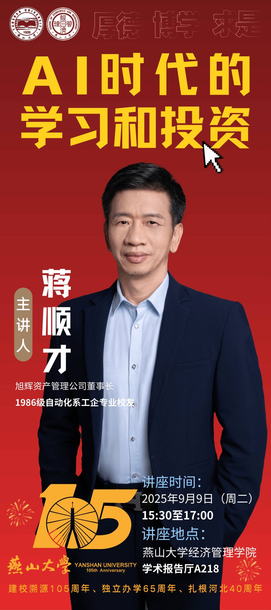 建校溯源105周年、独立办学65周年、扎根河北40周年校庆之际,校友返校周系列活动再掀高潮。9月9日,杰出校友蒋顺才博士重返母校,在经管楼A218报告厅带来"AI时代的学习和投资"主题讲座,与全体燕大人共探AI浪潮下的成长机遇。众多校友慕名前来参会。讲座由亚博体育