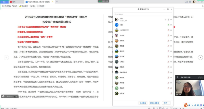 2022年10月12日,工商管理系党支部全体党员采用线上学习和交流的形式,共同学习了习近平总书记9月7日给北京师范大学“优师计划”师范生的回信。在信中习近平总书记勉励北京师范大学“优师计划”师范生到祖国和人民最需要的地方去,努力成为党和人民满意的“四有”好老师,并在第三十八个教师节来临之际,向全国广大教师致以节日的祝福。党员老师们纷纷表示要做有理想信念、有道德情操、有扎实知识、有仁爱之心的好老师,进一步健全“三全育人”的培养体系,为发展具有中国特色、世界水平的现代教育,培养社会主义事业建设者和接班人作出更大贡献。