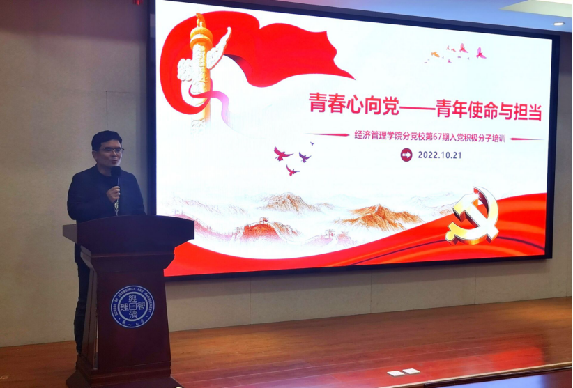 本科生党支部书记李迎家老师为同学们授课。本次活动采取线上、线下同步进行的方式,第67期党校培训入党积极分子全部参与。