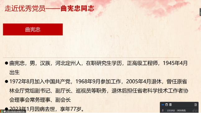 本科生第五党支部组织支部党员在线上举行“河北省优秀共产党员”曲宪忠同志先进事迹学习活动。