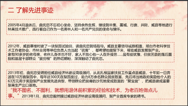 会议由党员刘雪莲主持,共分为走进优秀党员、了解先进事迹、汲取榜样力量三个部分。在第一部分中,刘雪莲同学为党员介绍曲宪忠同志的基本资料,让党员们对曲宪忠同志有了初步的了解。在第二部分中,刘雪莲同学从“不忘初心,牢记使命”、“播撒过种子的地方,都能发芽开花结果”、“一路艰辛一路凯歌,建就建高标准梨园”、“无论在岗还是退休,始终不放松要求”四个方面进行阐释,让曲宪忠同志的形象更加深入人心,激发着党员们对曲宪忠同志的敬爱之情。在第三部分中,刘雪莲同学总结曲宪忠同志的高尚品质,并指出使命呼唤担当,榜样引领时代,呼吁党员们以榜样为鞭策,强决心、聚动力,焕发初心不改、信仰弥坚的政治品格,培育至诚奉献、为民造福的高尚情操,抖擞担当作为、攻坚克难的奋斗精神,强化“四个意识”,坚定“四个自信”,凝聚起同心共筑中国梦的磅礴力量,努力创造属于新时代的光辉业绩。