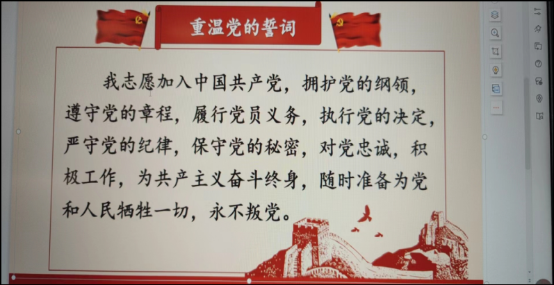 集中学习会议最后,由新入职党员袁润森同志带领大家重温入党誓词,各位党员老师庄重举起右手,再次庄严宣誓:我志愿加入中国共产党,拥护党的纲领,遵守党的章程,履行党员义务,执行党的决定,严守党的纪律,保守党的秘密,对党忠诚,积极工作,为共产主义奋斗终身,随时准备为党和人民牺牲一切,永不叛党。慷慨激昂、精神振奋。