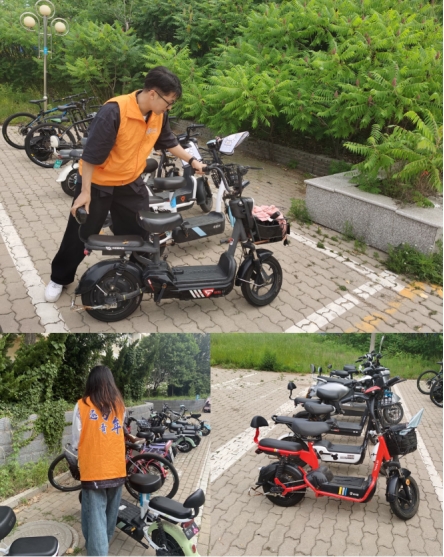 志愿者们还对经管楼周边的电动车、自行车等进行有序地摆放。活动中,志愿者们统一身穿橘色志愿马甲,把“摔倒”在路边的自行车扶起来,将道路两旁随意停放的自行车推到指定停放点摆放整齐,同时向过往学生积极宣传文明骑行、有序停放的重要意义,引导骑行者将自行车摆放到相对集中的停放区域,鼓励大家监督身边存在的不文明行为,共享文明校园生活。