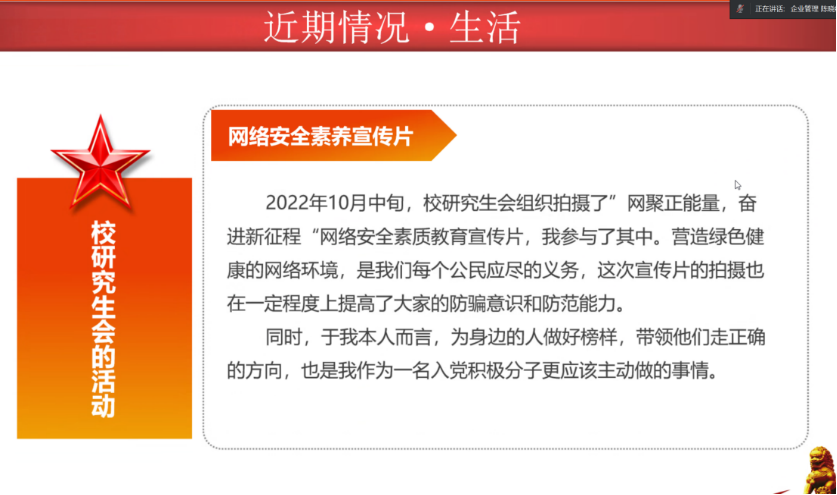 活动、社会服务和志愿服务情况等。通过线上“互动”答辩,有助于督促入党积极分子主动学习党的理论知识,更有助于党支部对学生进行精准指导。