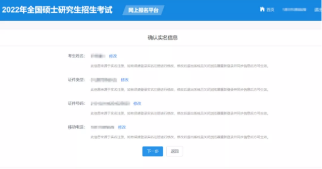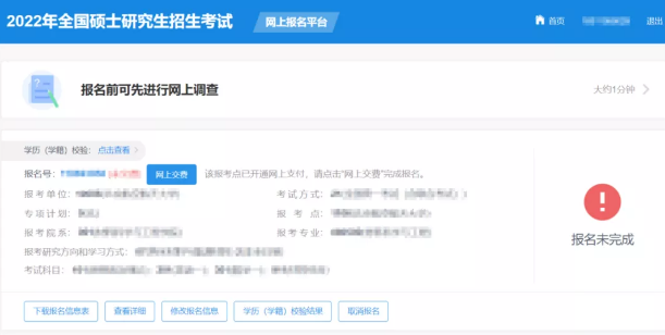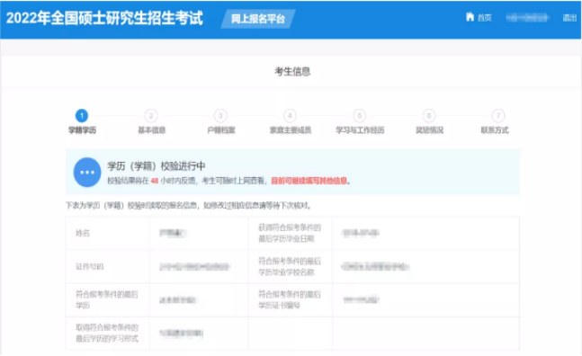 确认实名注册信息后,考生首先要按照《2022年全国硕士研究生招生工作管理规定》要求填写正确的学历(学籍)信息。如遇网络拥堵等特殊情况,将出现“进行中”的状态,考生可以继续填写考生信息中的其他部分,不影响接下来的操作。未能通过学历(学籍)网上校验的考生应在招生单位规定时间内完成学历(学籍)核验,根据招生单位要求提供相应核验材料。