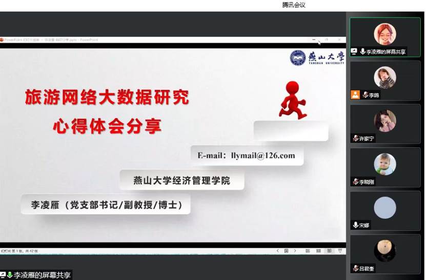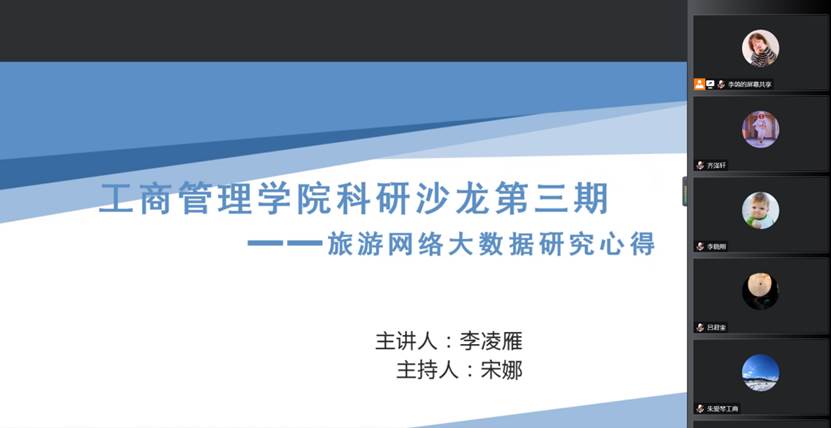 院长吕君奎作开场白,欢迎李凌雁老师开讲,其次宋娜副院长介绍李凌雁老师的学术经历和学术成果。活动过程中李凌雁老师围绕科研经历分享、旅游网络大数据的研究心得两个方面进行了详细的讲解。最后,李凌雁老师与参会老师们进行了热烈的讨论,将整个活动的气氛推向高潮。