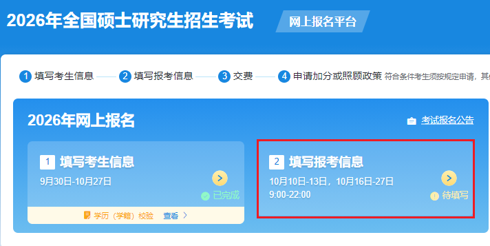 全国硕士研究生招生考试报名包括网上报名和网上确认两个阶段。所有考生均须在规定时间登录“中国研究生招生信息网”(简称“研招网”)(//yz.chsi.com.cn)填报网上报名信息、网上支付报考费,并按照所选报考点要求进行网上确认。只有完成以上步骤,报名流程才完成。